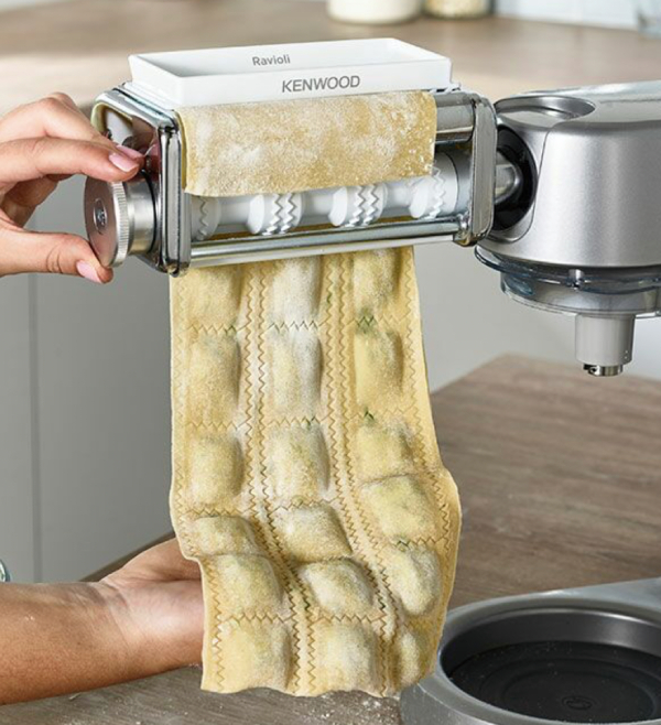 Mit dem Kenwood Ravioli-Aufsatz raffiniert gefüllte Pasta ganz einfach selbst herstellen. Den Nudelteig vorbereiten und mit der Kenwood Pastawalze auf etwa Stufe 4 - 5 walzen. Danach die Teigplatten in den Raviolimaker geben und die Füllung mit dem Löffel zugeben und die Lasagneplatten von Hand weiter drehen. Die Küchenmaschine dient lediglich zum Halten des Raviolimakers.