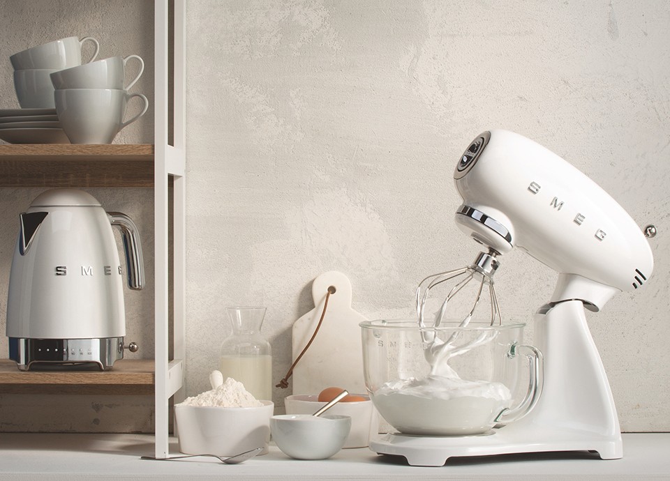 Die Smeg Küchenmaschine im 50er-Jahre-Stil vereint Eleganz mit Leistung und bietet 10 Geschwindigkeitsstufen sowie ein Smooth Start System für optimale Teigverarbeitung.