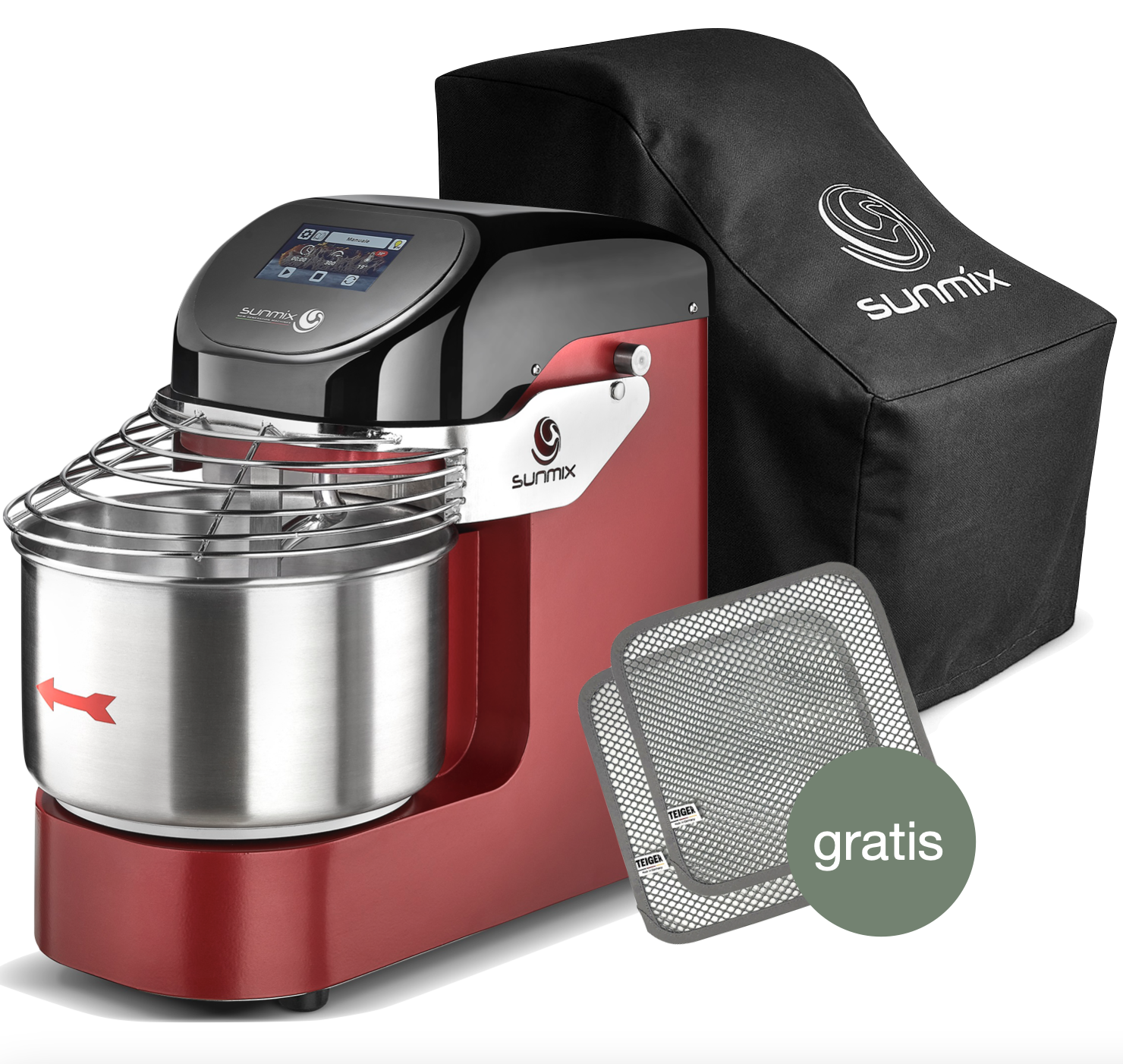 Sunmix EVO 6 Spiralkneter Rot - inkl. Abdeckhaube und gratis 2 TEIGER Teig - Reinigungstücher