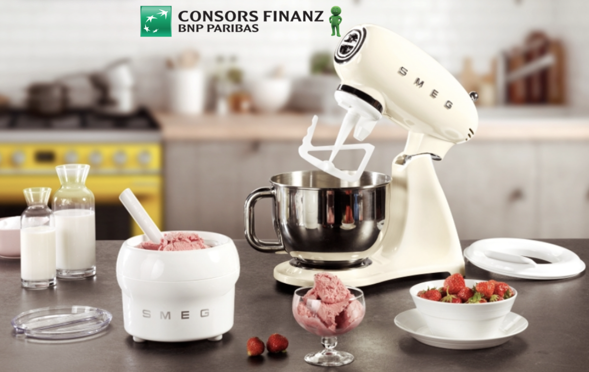 Mit Consors Finanz bei Kitchenpoint kannst Du jetzt sämtliche Küchenmaschinen von Smeg ganz einfach und flexibel finanzieren. Gemeinsam mit Consors Finanz bieten wir Dir die Möglichkeit, Deine neue Premium-Küchenmaschine bequem in transparenten Monatsraten zu bezahlen.