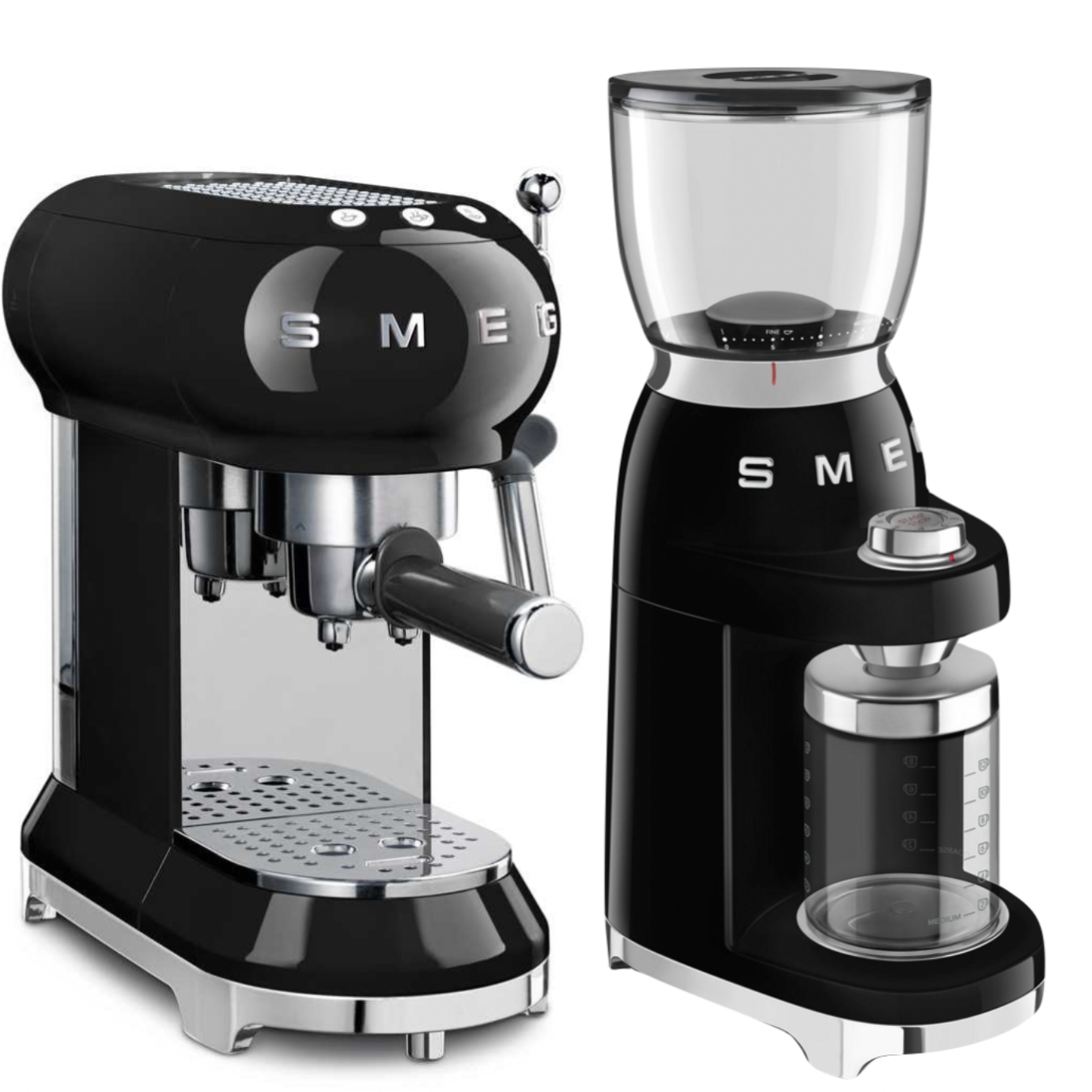SMEG Espresso Set auf Kaffeemühle und Espressomaschine